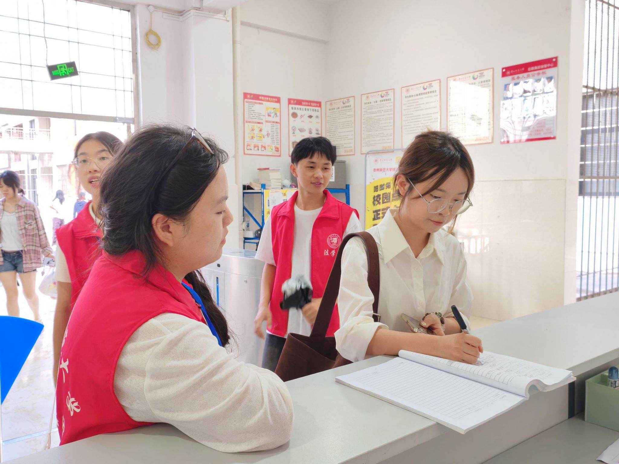 30日早上七点半,全体迎新志愿者就位。报到组师生驻守香樟广场迎新点,严格执行收取并扫描新生录取通知书、发放一卡通、新生安全须知,引导班级微信群扫码等流程,确保“一站式”报到顺畅,让新生入学首步规范又温暖 。