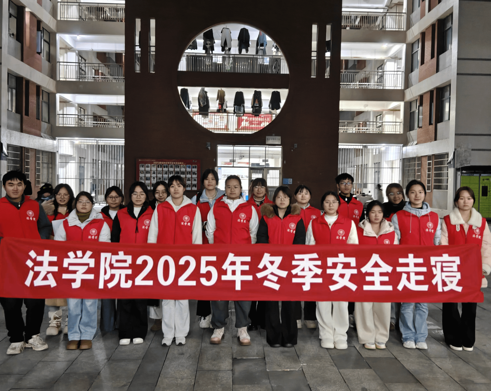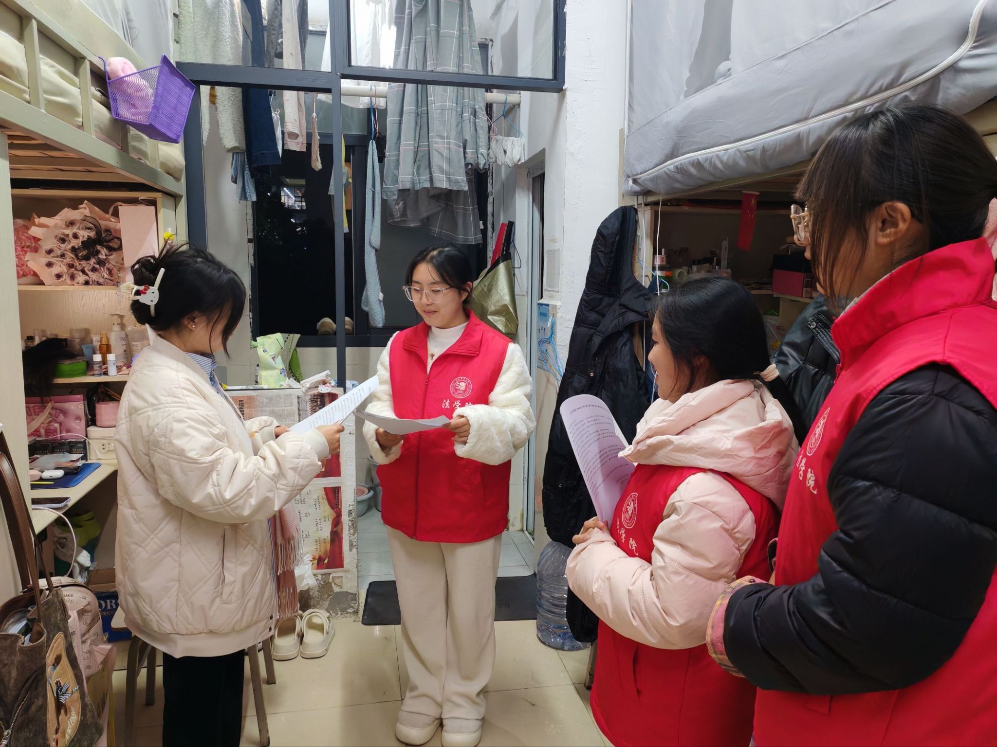 为强化学生的安全防范意识,营造安全和谐的寝室环境,2025年12月3日晚,法学院学生会联合团委、青分会、学生党建中心以及学生事务中心在各学生宿舍楼开展了“安全护航 温馨寝室”安全走寝活动。