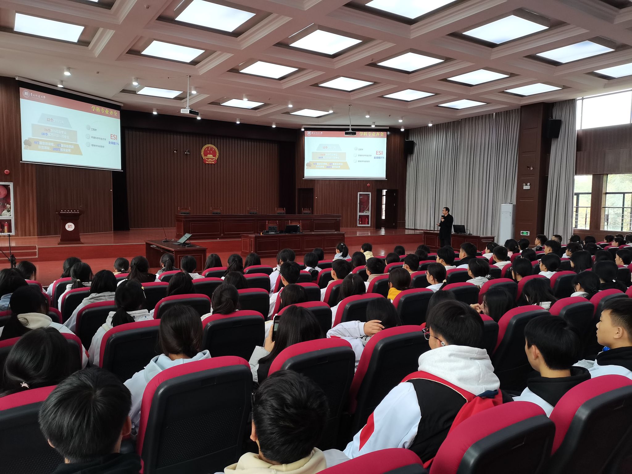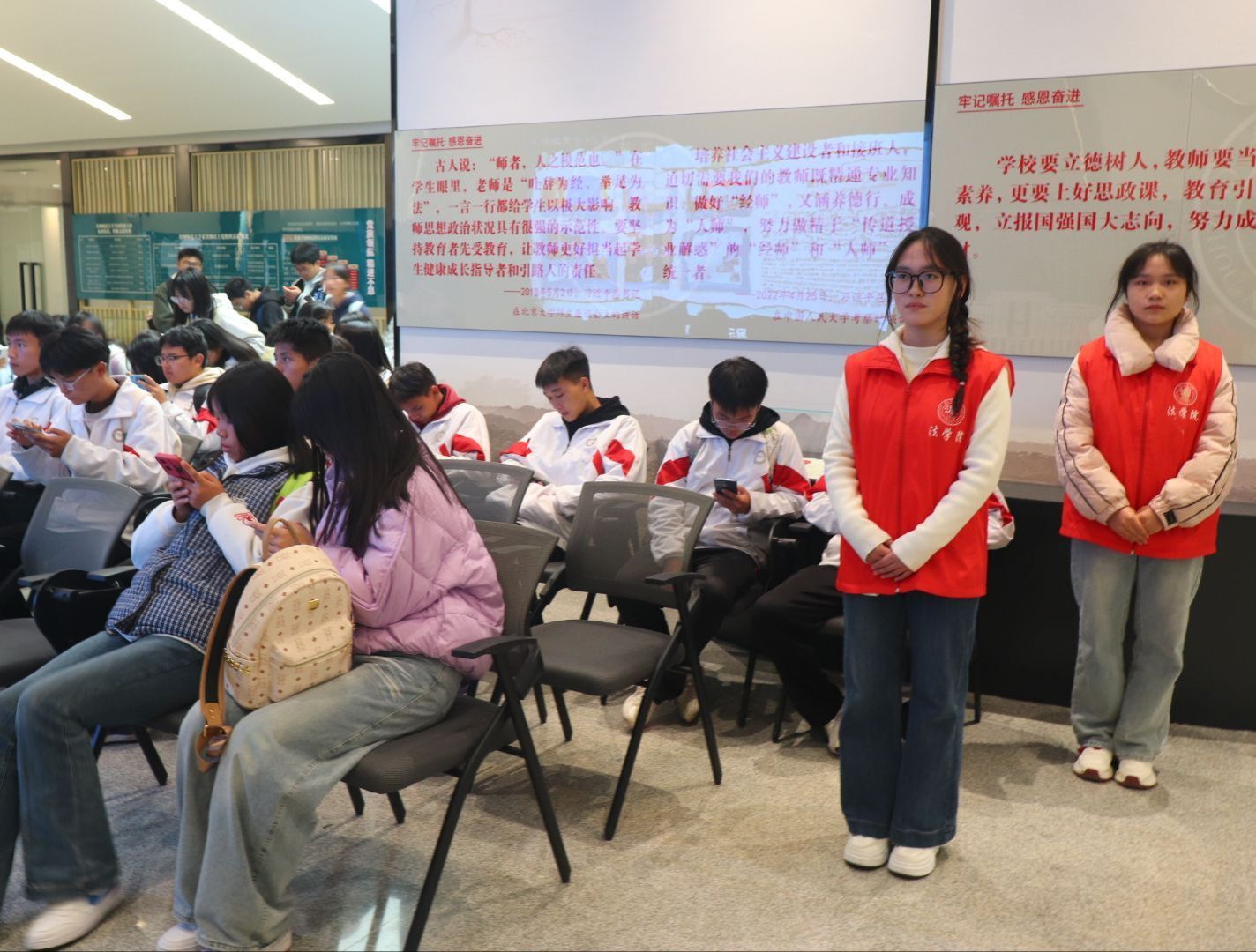 活动当日,志愿者团队以“迎-引-讲-探”四维服务模式展开工作。上午9时,研学团队抵达师大后,首先在法学院法治长廊开展法治文化讲解,志愿者通过“案例解析+互动问答”形式讲解中国法治化进程中的重要节点、宪法故事、民法典亮点,将抽象法治理念转化为具体生活场景。随后,在大模拟法庭,法学院党委书记梅应贤作校情院情和招生专题宣讲,围绕学校80余年办学史、师资、学科建设、专业、教学资源、高考录取情况、优师计划和致新班、学生活动及校园环境等,同时介绍了法学院的发展情况,激发中学生对高校的向往。