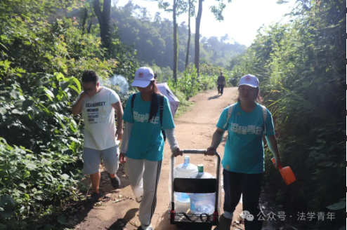 随后,法学青年前往一位双目失明老人家中,为其送去大米、食用油等生活必需品。看到老人行动不便、家中用水困难,志愿者们立即协助其妻子挑水、整理院落。朴实的老人妻子握着志愿者的手连声道谢:“你们真是能干又懂事的好娃娃!”一句句真挚的话语,既是肯定,更是激励。